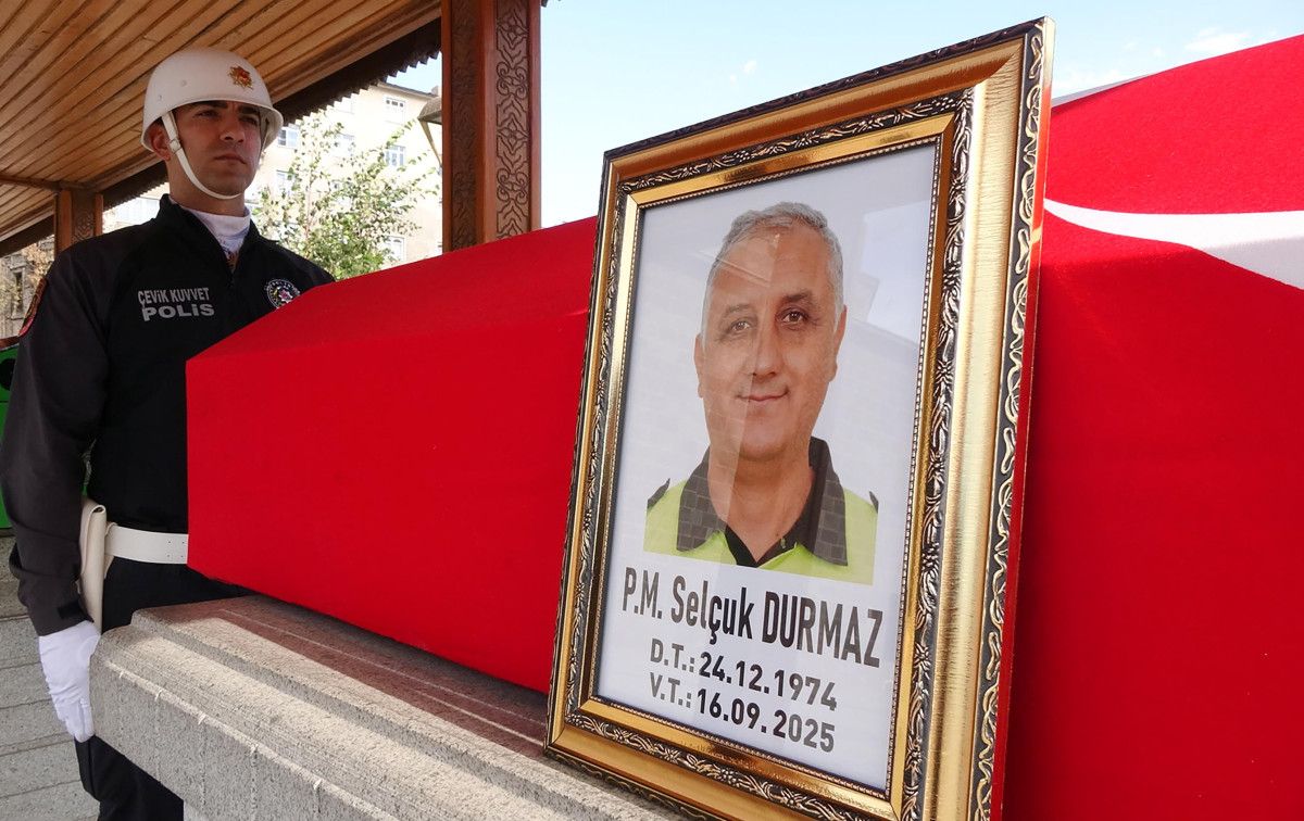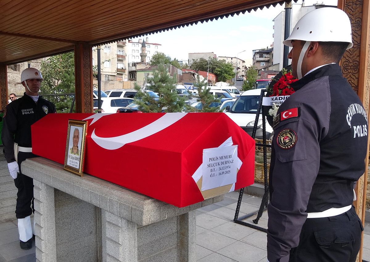 Erzurum’da aort damarı yırtılan ve kaldırıldığı hastanede hayatını kaybeden 51 yaşındaki trafik polisi Selçuk Durmaz, meslektaşları tarafından son yolculuğuna uğurlandı..
