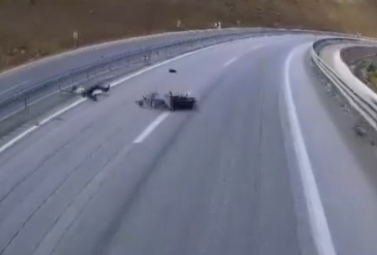 Görüntülere, virajda motosikletin bariyerlere çarparak yola savrulduğu anlar görüldü.