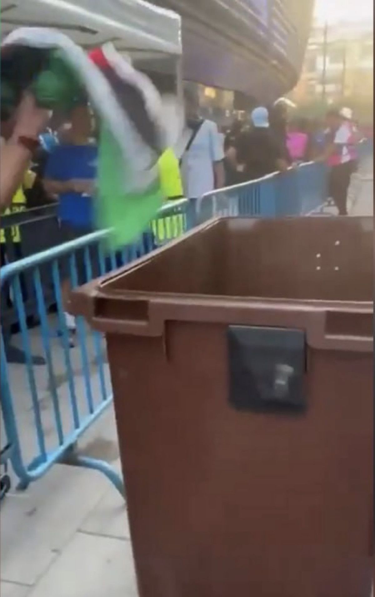 Fransız taraftarların elindeki Filistin bayraklarını toplayan güvenlik görevlileri, bayrakları stat girişindeki çöp kutusuna attı.