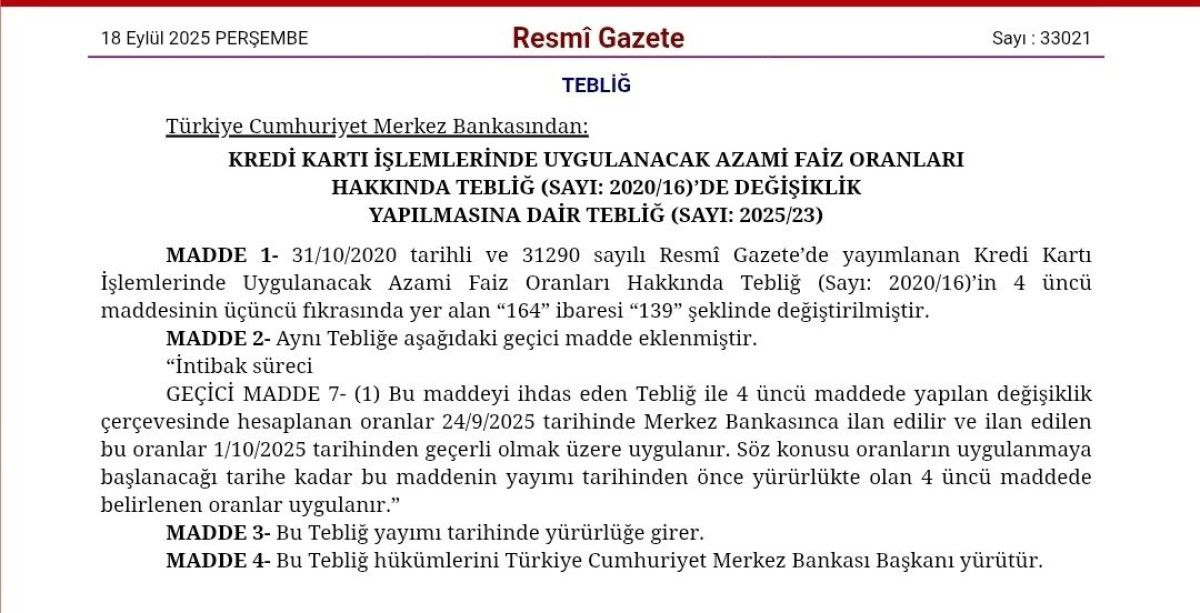 Resmi Gazete’de yayınlanan tebliğe göre, yeni oranlar 1 Ekim’den itibaren geçerli olacak.