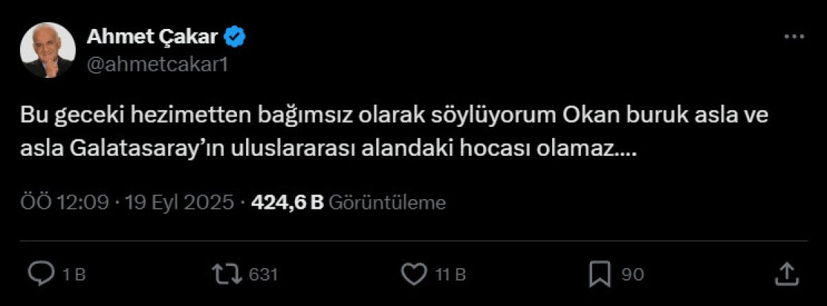 Galatasaray teknik direktörü Okan Buruk hakkında bir paylaşım yapan Ahmet Çakar dikkatleri üzerine çekti.