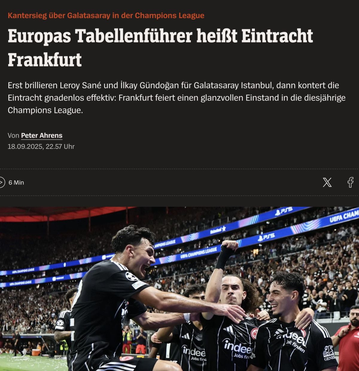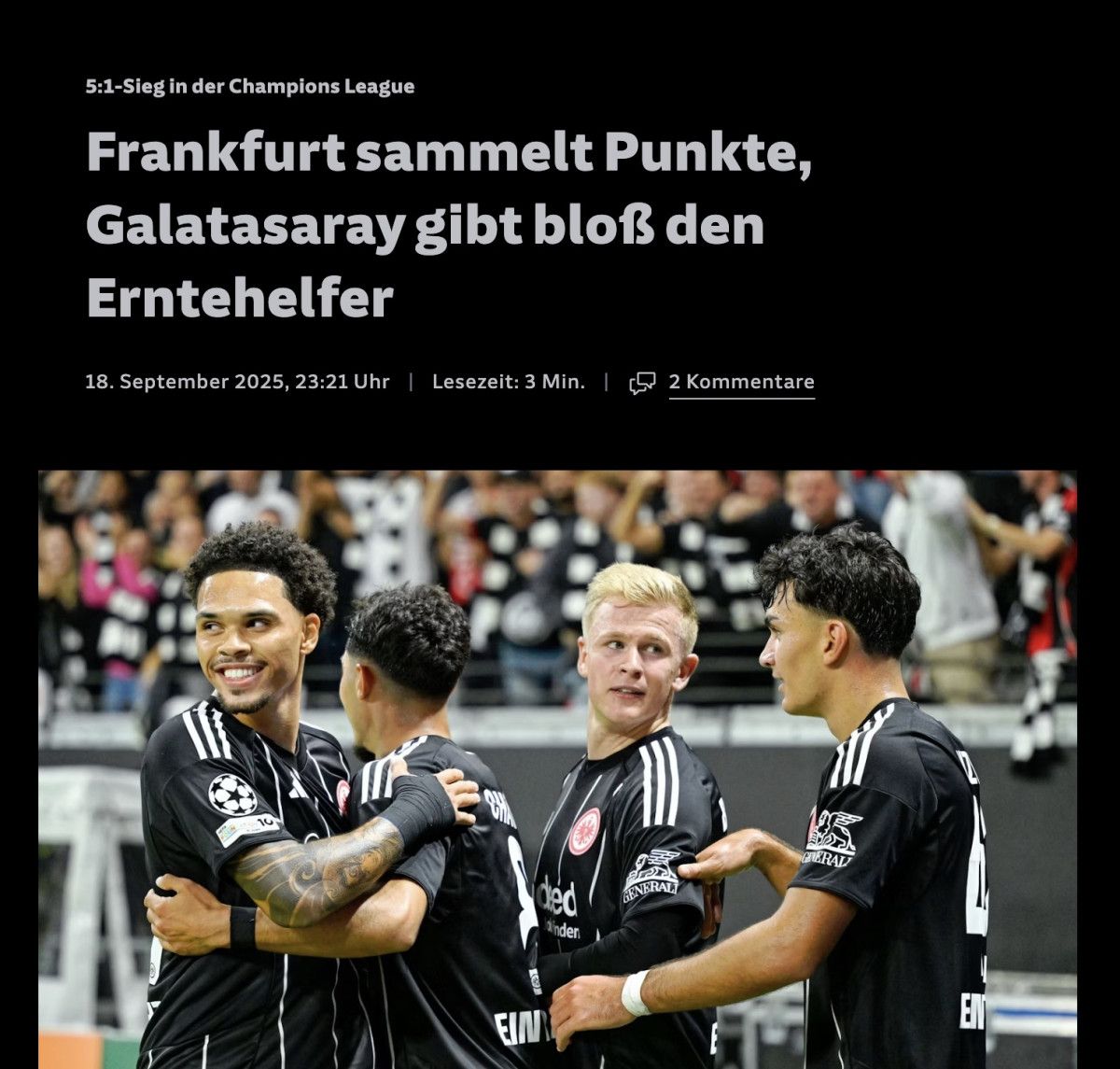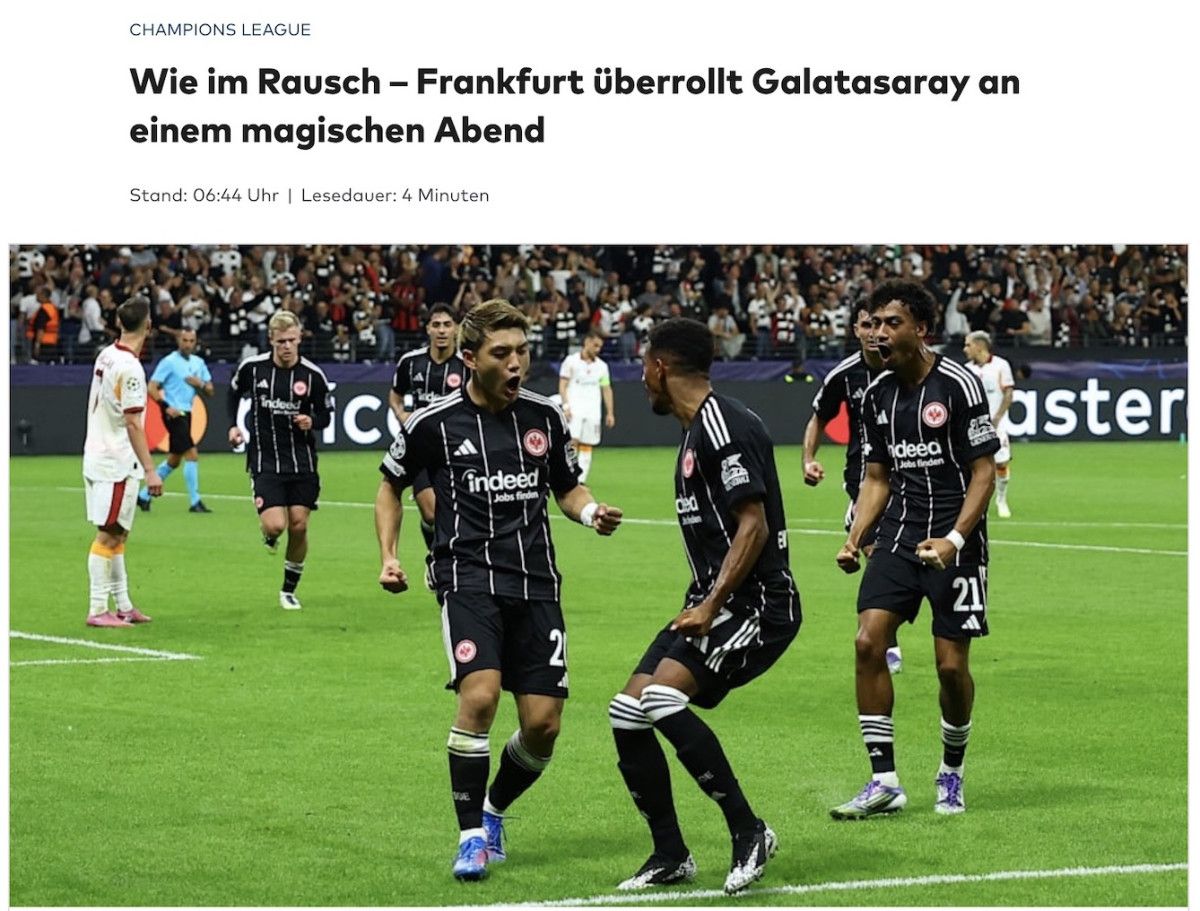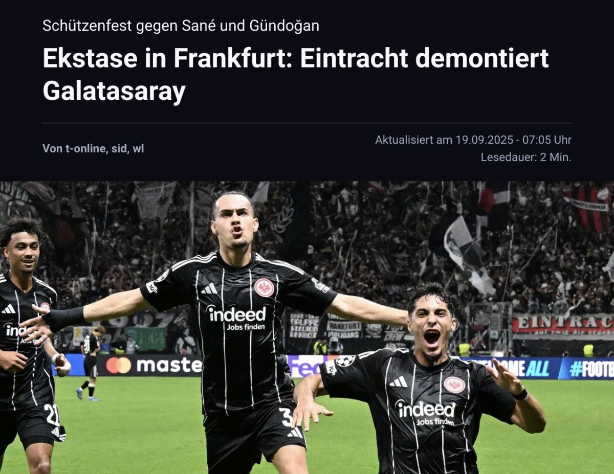 “Frankfurt’ta coşku: Eintracht, Galatasaray’ı dağıttı. Eintracht Frankfurt, Şampiyonlar Ligi’ne mükemmel bir başlangıç yaptı. Leroy Sane ve İlkay Gündoğan, Galatasaray’da fiyasko yaşadı.”