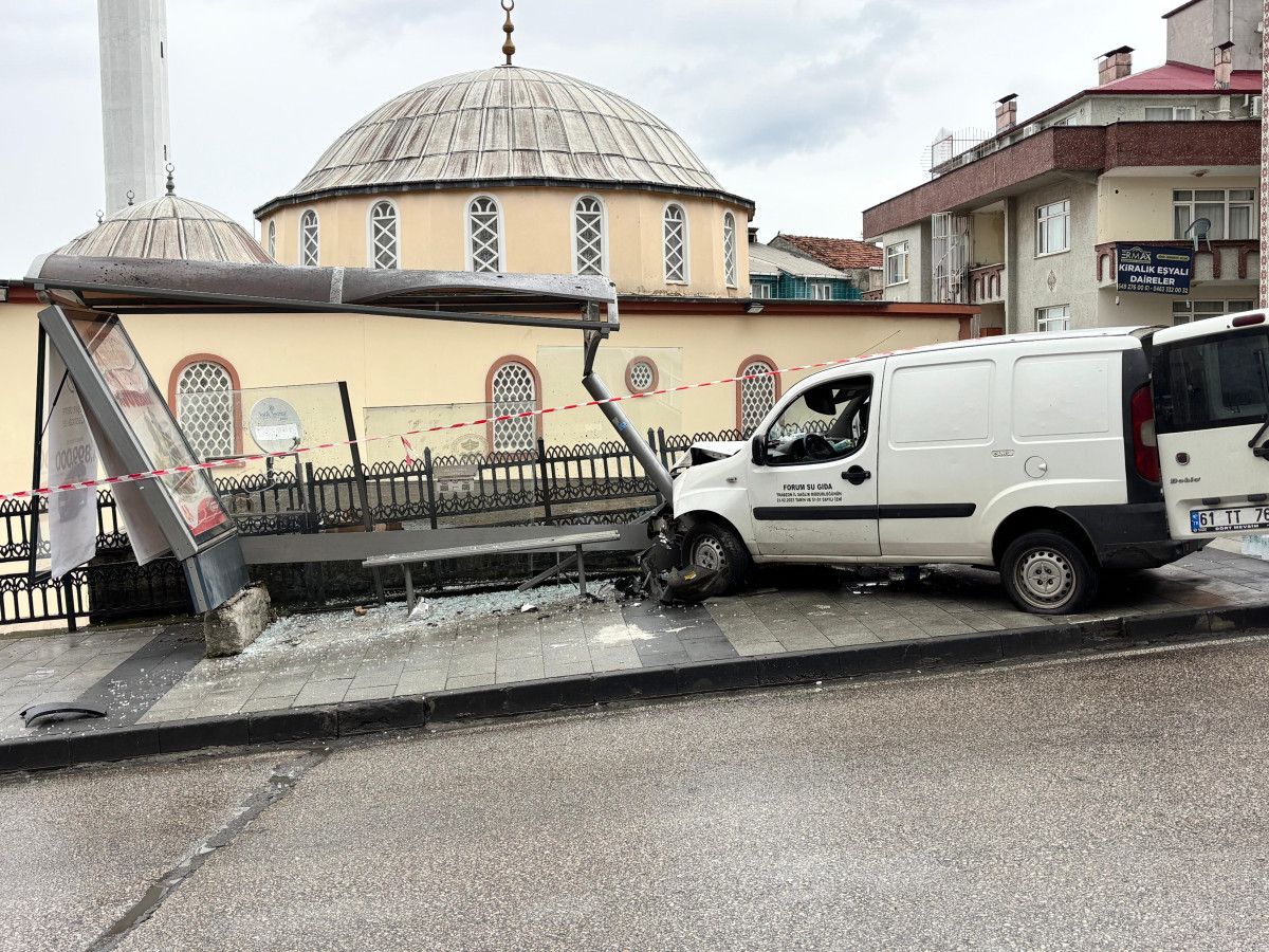 Trabzon’un Ortahisar ilçesine bağlı Kalkınma Mahallesi’nde sürücüsü belirlenemeyen hafif ticari araç, sürücünün el frenini çekmemesi nedeniyle yokuş aşağı kayarak otobüs durağına çarptı.
