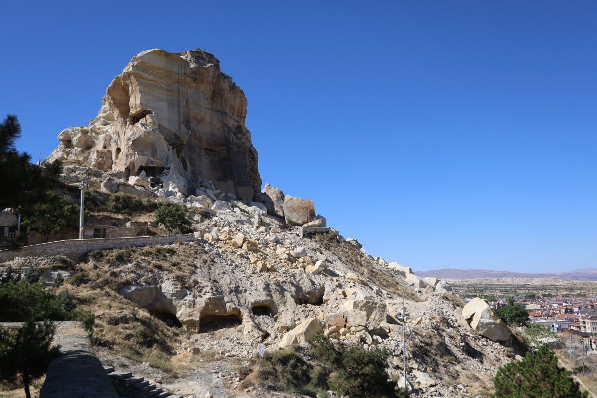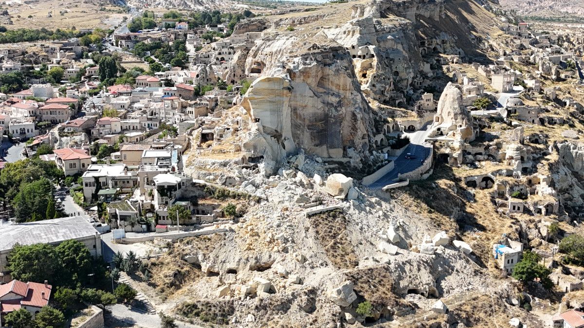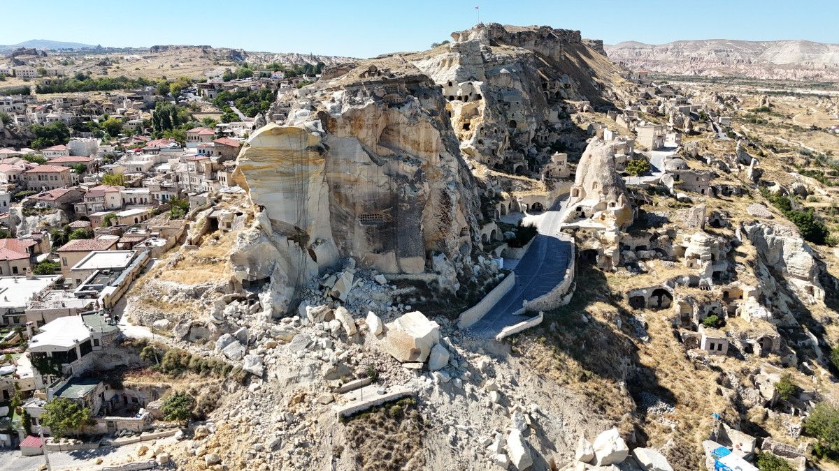 Kapadokya’da Ürgüp’teki Kadıkalesi’nin ön kısmından büyük bir kaya parçası koparak düştü. Çevredeki evler ve otel tahliye edildi. O anlar güvenlik kamerasına yansıdı.