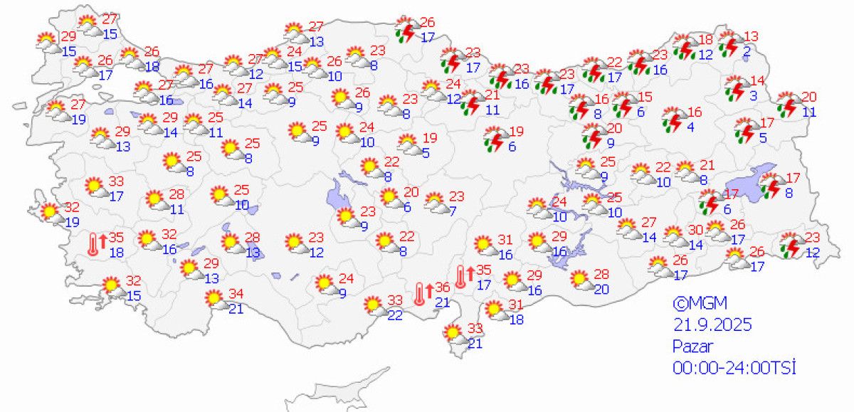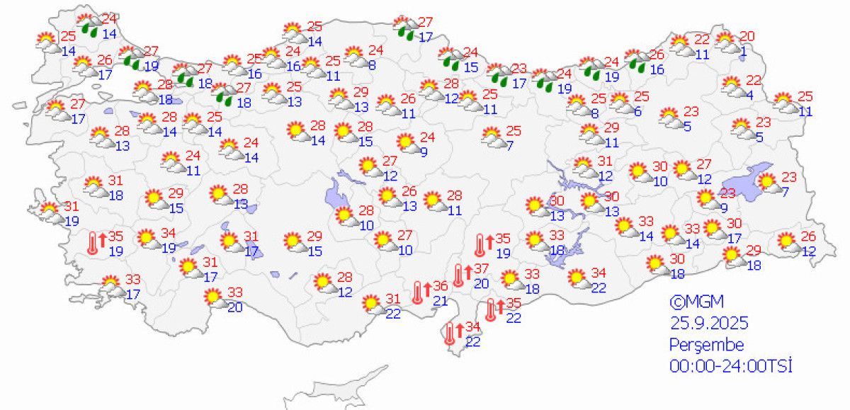 Akdeniz kıyılarında 33-36 derece, Ege’de 30-35 derece öngörülürken, Karadeniz’in doğusunda 24-28 derece ile nispeten ılıman bir gün yaşanması bekleniyor.