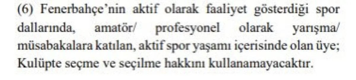 Tüzükte yer alan 15. maddenin 6. fıkrasında, “F.Bahçe’nin aktif olarak faaliyet gösterdiği spor dallarında, amatör/ profesyonel olarak yarışma/müsabakalara katılan, aktif spor yaşamı içerisinde olan üye; kulüpte seçme ve seçilme hakkını kullanamayacaktır.” ifadeleri yer alıyor.