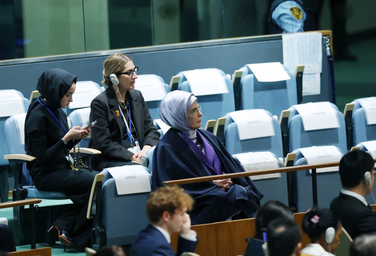 Eşi Emine Erdoğan da Türkevi’nden birlikte yürüyerek geçtikleri BM Genel Merkezi’nde Cumhurbaşkanı Erdoğan’ın, BM’nin 80. Genel Kurulu’nda yaptığı konuşmayı salonda dinledi.