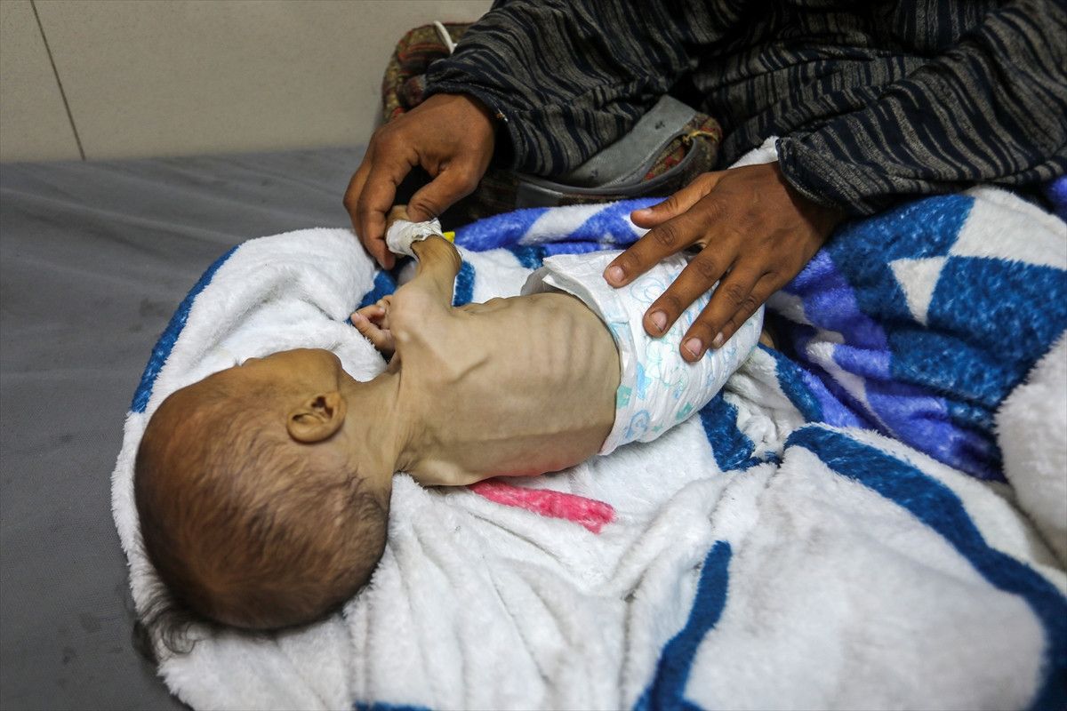 Yetersiz beslenme nedeniyle hayati tehlike yaşayan 2 aylık bebek Eid Ebu Cami, kısıtlı imkanlarla Han Yunus’taki Nasır Hastanesi’nde tedavi ediliyor.