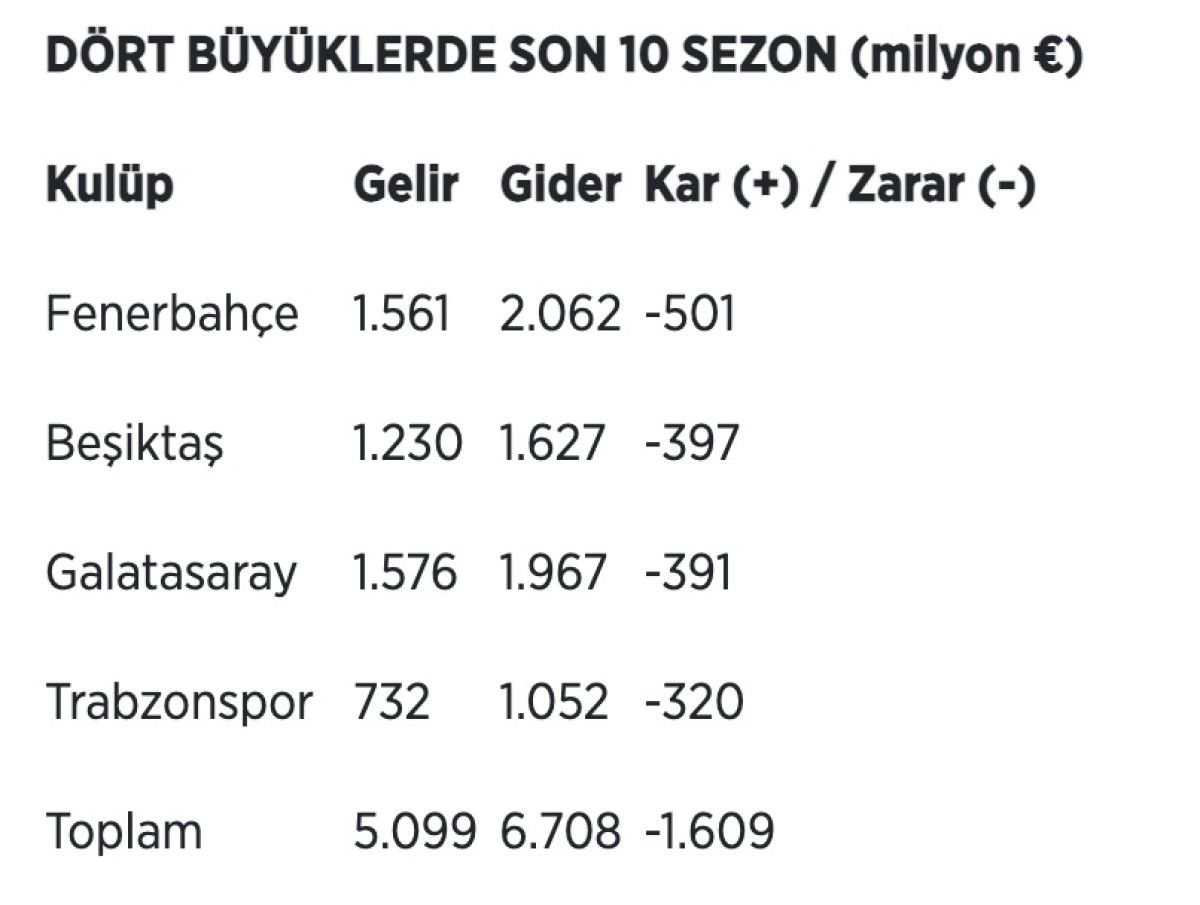Türk futbolunun dört büyükleri olarak nitelenen Beşiktaş, Fenerbahçe, Galatasaray ve Trabzonspor son 10 yılda toplamda 1 milyar 609 milyon euro zarar etti.
