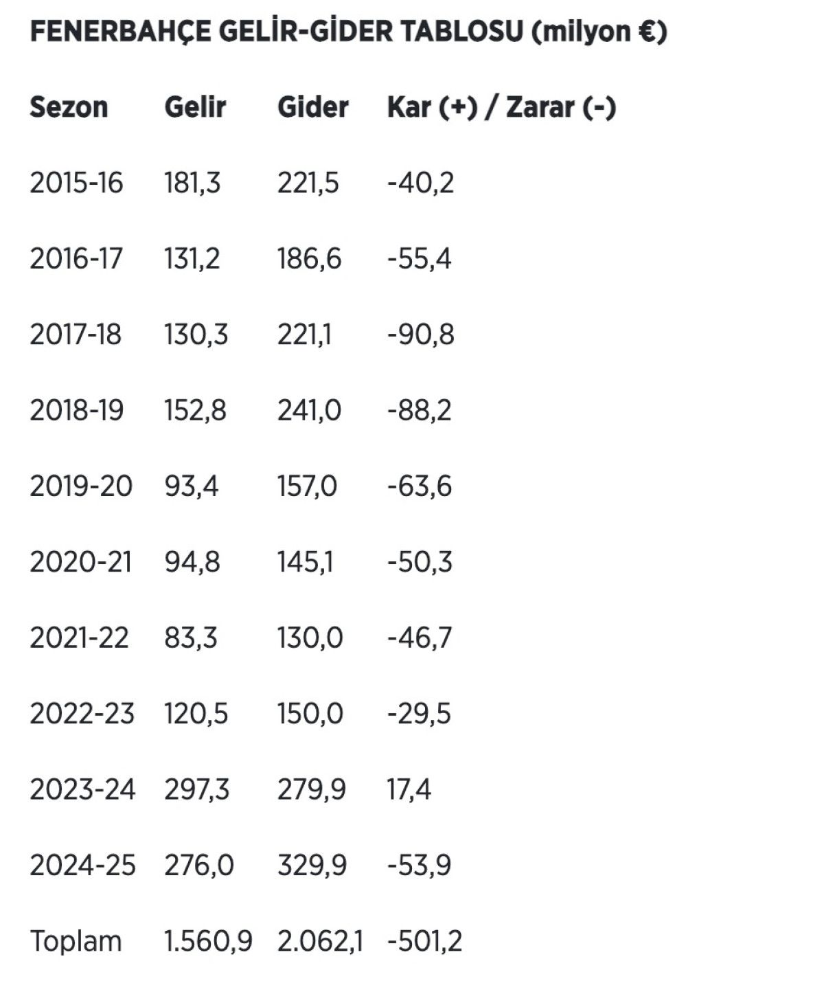 Fenerbahçe’nin 501 milyon euro zarar ettiği son 10 sezonun gelir-gider tablosu şöyle: