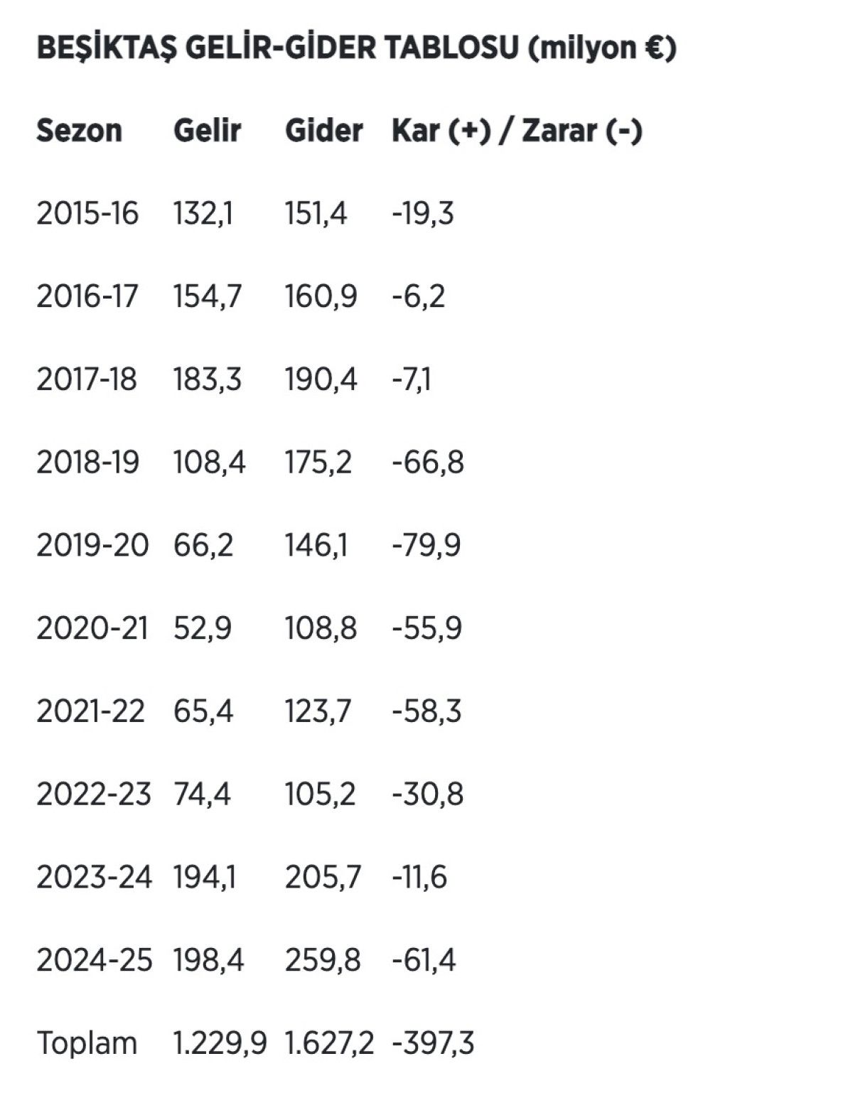 BEŞİKTAŞ’TAKİ ZARAR 397 MİLYON EURO