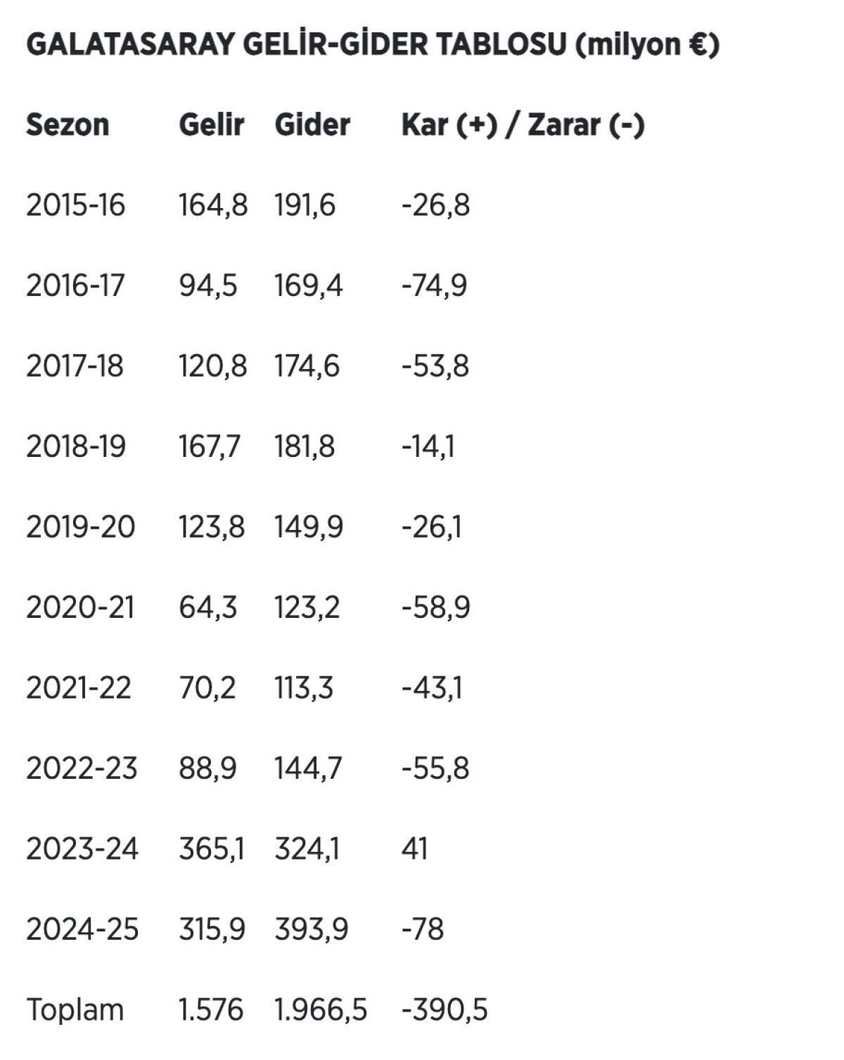 Gelirlerinin toplamı 1 milyar 576 milyon eruo, gider toplamı ise 1 milyar 966 milyon euro olarak gerçekleşen sarı-kırmızıların 10 sezonluk tablosu şöyle: