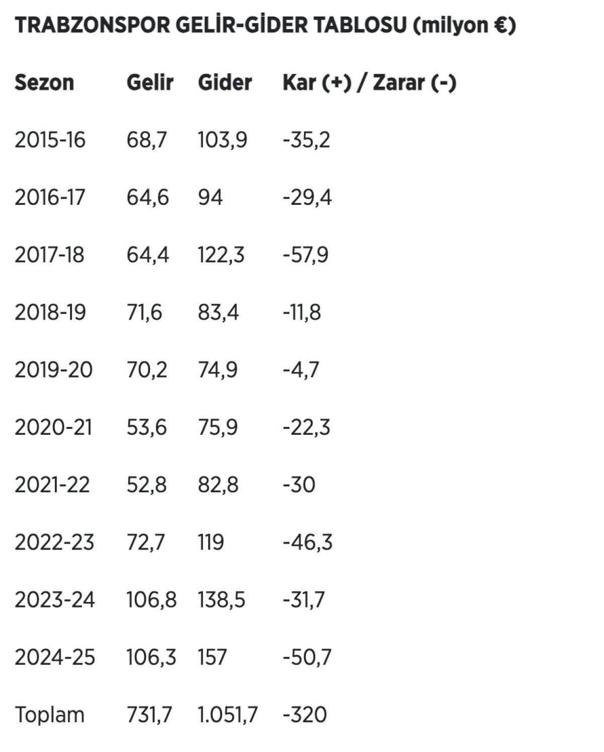 Karadeniz kulübünün 10 yıllık gelir-gider tablosu şöyle: