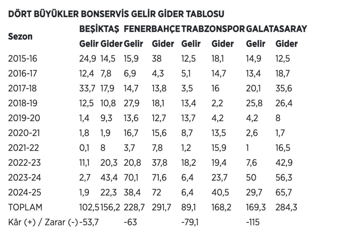 Bu sezonki bonservis harcamalarıyla dikkati çeken dört büyükler, geride kalan 10 sezonda toplamda 310,8 milyon avroluk zarar etti.
