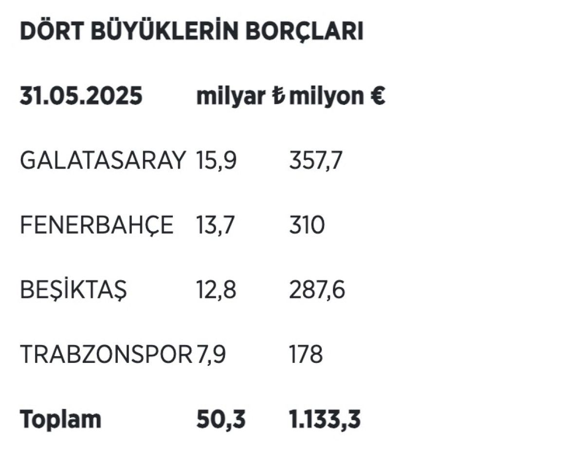 Mayıs ayı sonu itibarıyla bankalara 3,62 milyar lira borcu bulunan Fenerbahçe ile 3,04 milyar lira borcu olan Beşiktaş’ın da bu sezon içinde borçlarını kapatması bekleniyor.