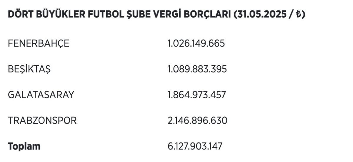 Beşiktaş, Fenerbahçe, Galatasaray ve Trabzonspor şirketlerinin, devlete olan SGK ve vergi borçları toplamı 6,1 milyar liranın üzerinde bulunuyor.