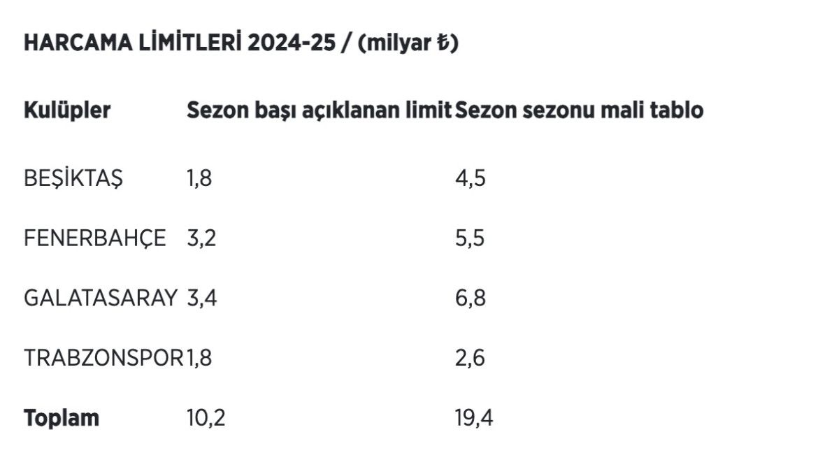 Örneğin 2024-25 sezonu başlarken TFF’nin duyurduğu takım harcama limitlerinde dört büyüklerin toplam bütçesi 10,2 milyar lira.