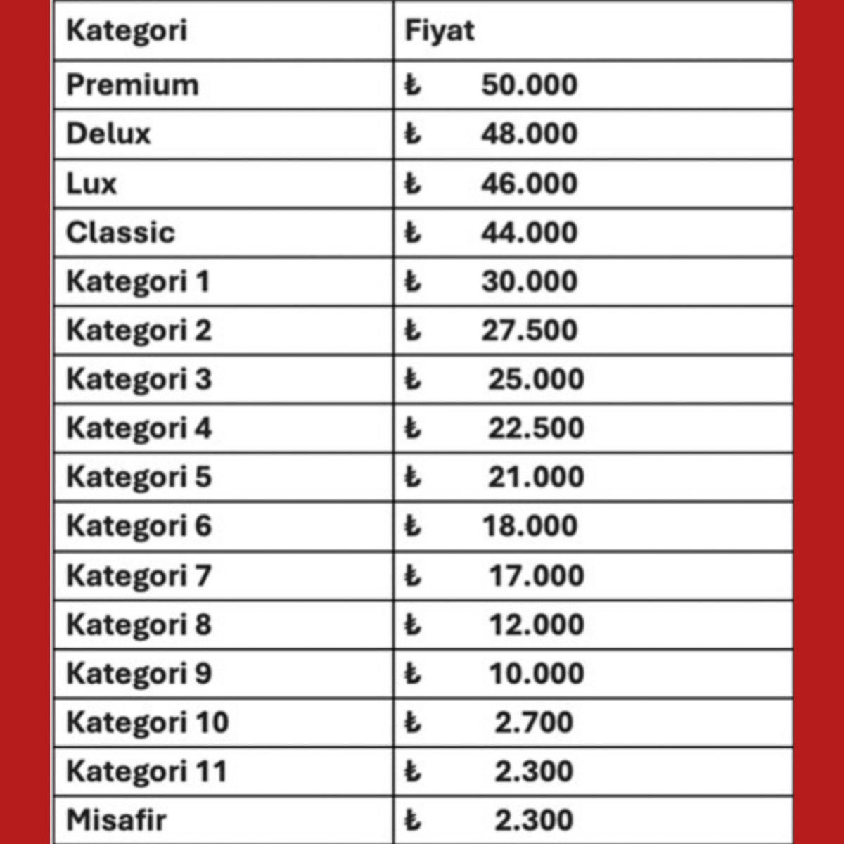 Premium biletleri sırasıyla Delux (48.000 TL), Lux (46.000 TL) ve Classic (44.000 TL) kategorileri takip ediyor.