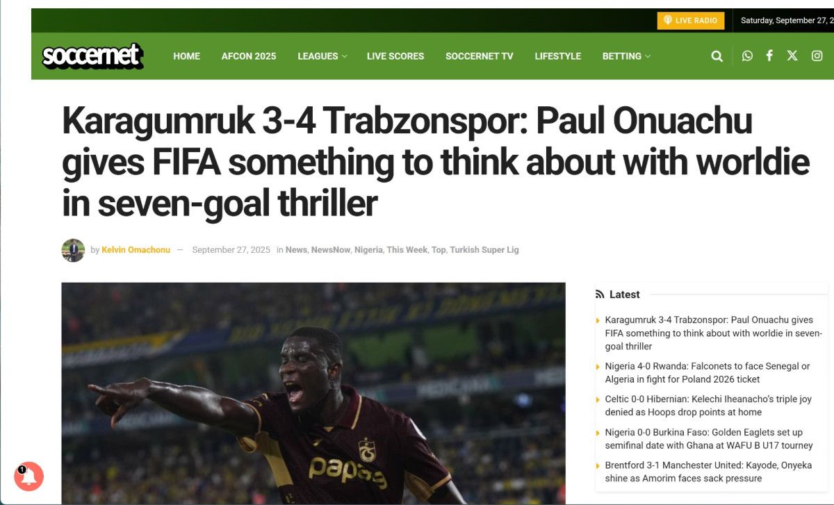 Trabzonspor’un Nijeryalı forveti Paul Onuachu, Fatih Karagümrük maçında attığı sıra dışı golüyle sadece Türkiye’de değil, uluslararası basın ve sosyal medya gündeminde de geniş yankı uyandırdı.