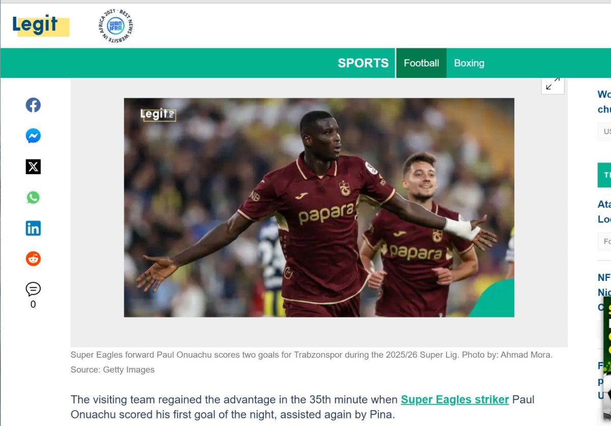 Nijerya basınından Legit.ng, Onuachu’nun sıra dışı golünü ‘Harika bir overhead kick’ olarak nitelendirdi ve X platformunda viral hale geldiğini yazdı.