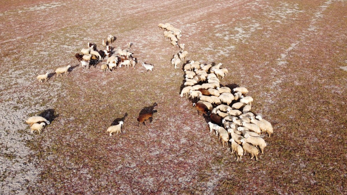 Dron kamerasıyla kaydedilen görüntülerde, Esenli köyünde yer alan Gelingüllü Barajı’nın büyük oranda kuruduğu ve ortaya çıkan geniş alanlarda koyun sürülerinin otlatıldığı görüldü.