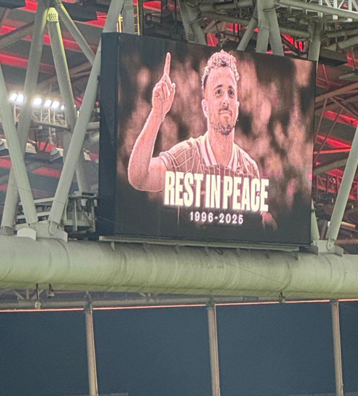 Ayrıca sarı-kırmızılı taraftarlar kale arkasına yer alan bölümde “Rest In Peace Ahmet & Jota” pankartı açtı.