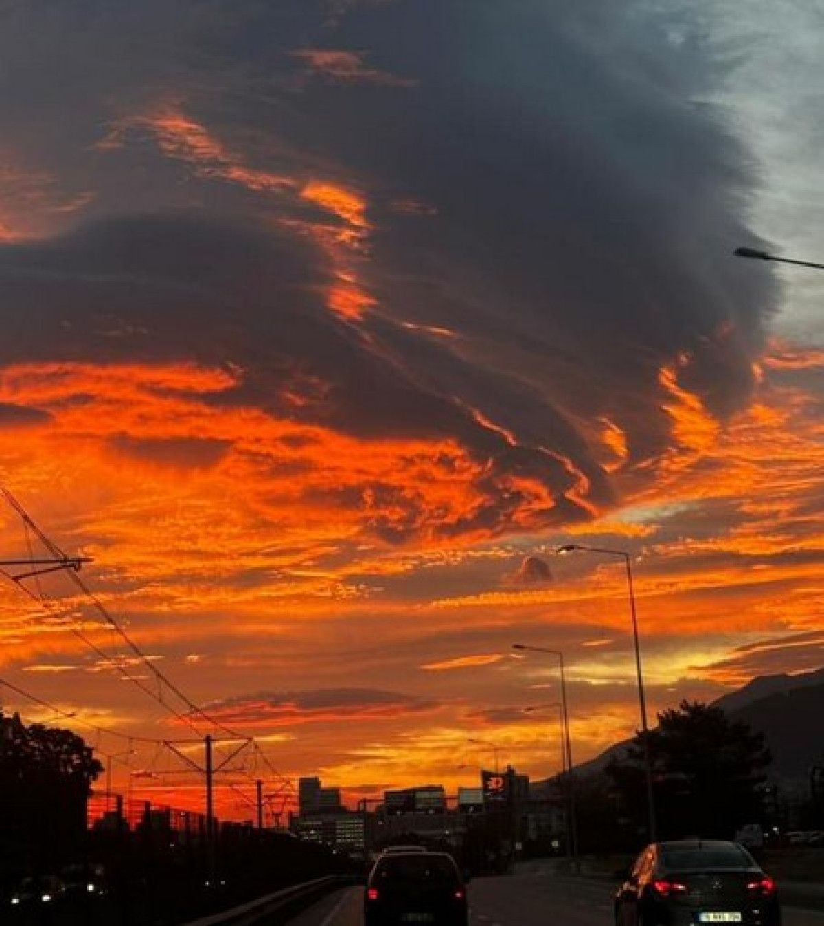Bursa’da sabah gökyüzünde oluşan sıra dışı bulutlar, gün doğumunun turuncu ve kırmızı tonlarıyla birleşerek kartpostallık görüntüler oluşturdu.