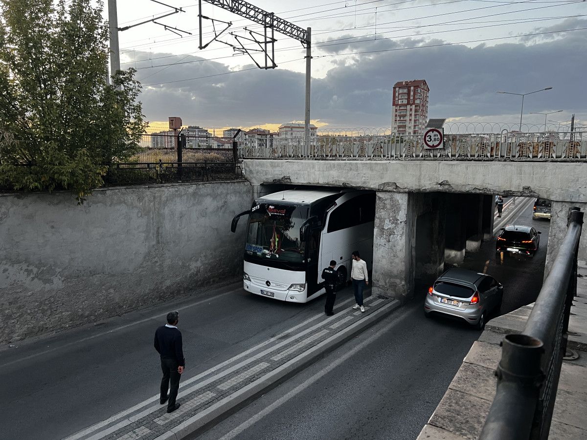 Vali Muammer Güler Sahası’nda antrenman yapan oyuncuları otele götüren 04 AS 250 plakalı otobüs, merkez Kocasinan ilçesi Bağdat Caddesi’ndeki alt geçide sıkıştı.