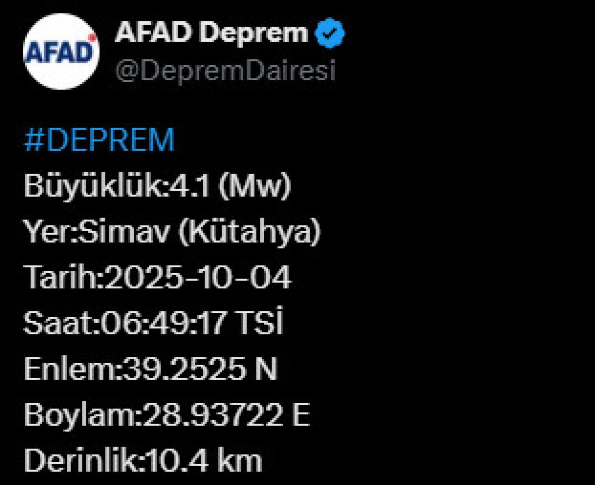 AFAD’dan yapılan açıklamalara göre Kütahya’nın Simav ilçesinde saat 06.49’da 4.1 büyüklüğünde deprem oldu.