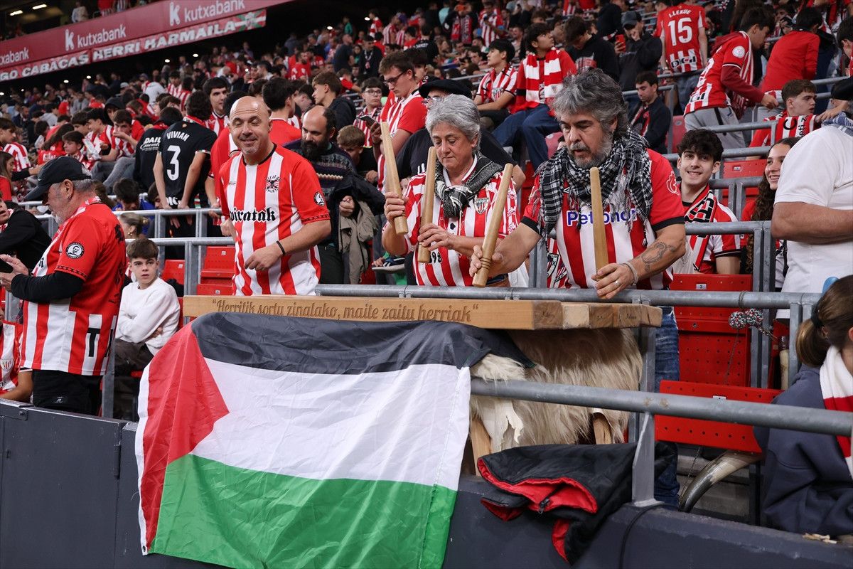 Athletic Bilbao taraftarları, maç öncesi tribünlerde Filistin bayrağı açtı.