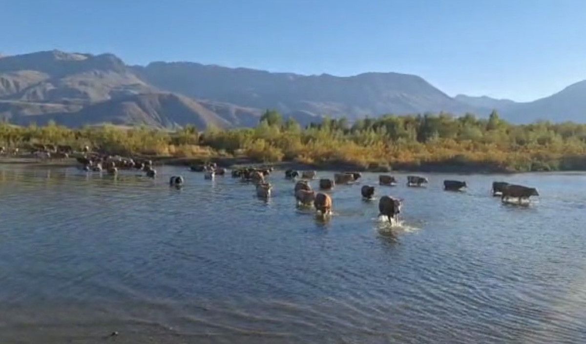 Erzincan’ın Büyük Kadağan köyü mevkiinde otlaktan dönen büyükbaş hayvanlar, su seviyesinin azalmasıyla birlikte Karasu Nehri’ni yürüyerek geçmeye başladı.