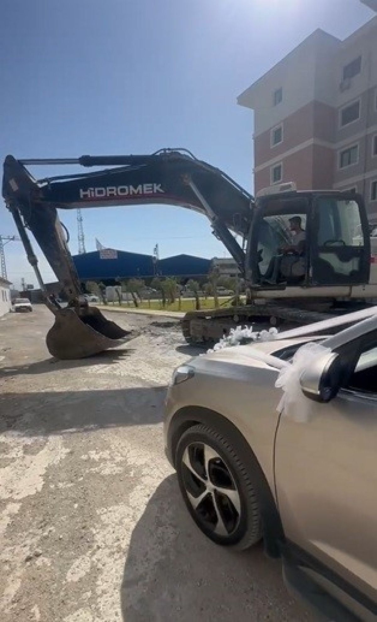 Antakya ilçesinde, operatörün iş makinesiyle gelin arabasının yolunu kestiği anlar sosyal medyada yüzleri gülümsetti. 150 TL bahşiş alan operatör yolu açtı.