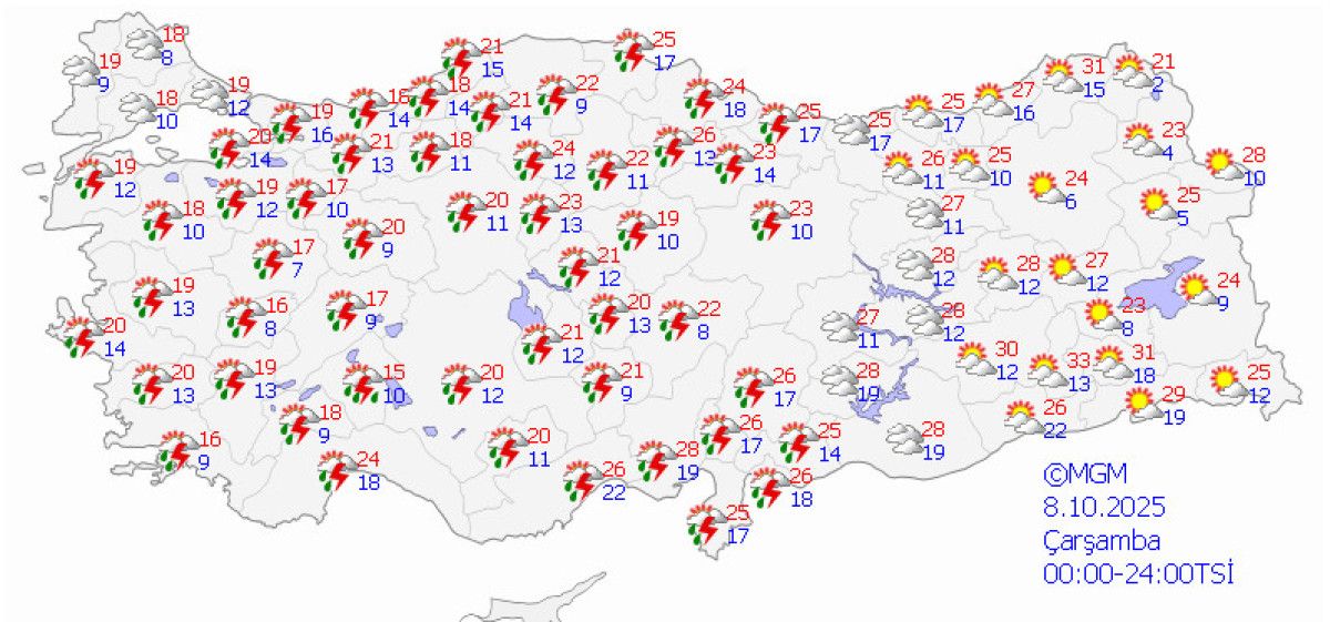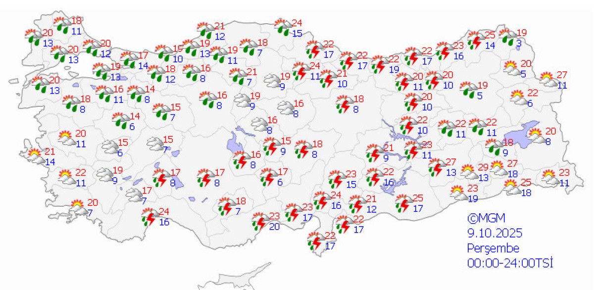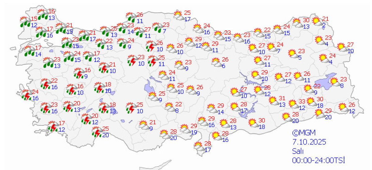 Yarın akşam saatlerinden sonra Trakya’nın batısı ve Kıyı Ege’de yağışların başlayacağını aktaran Çelik, “Salı günü ise batı ve iç bölgelerimizin hemen hemen tamamında yağışlar var. Salı günü özellikle Marmara, Ege ve Batı Akdeniz’deki yağışların yer yer kuvvetli gök gürültülü sağanak şeklinde olmasını bekliyoruz.” ifadelerini kullandı.