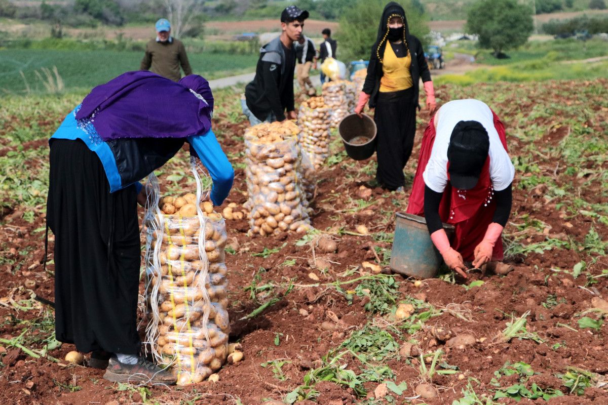 Günlüğü 600 lira olan patates toplama işçileri, tarlalarda kovalarla patatesleri topluyor.