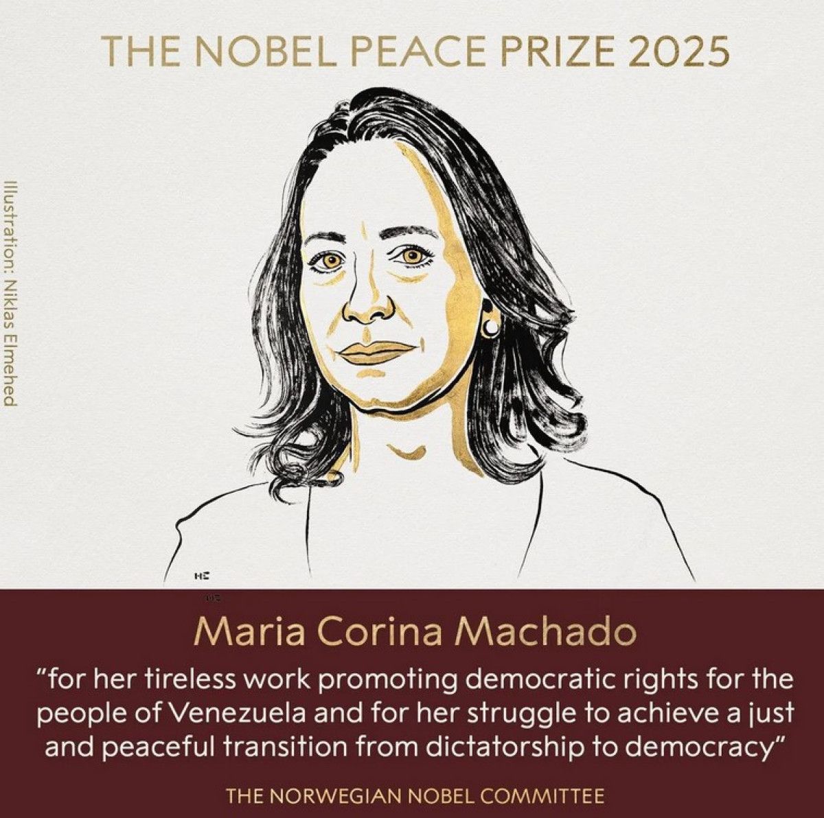 2025 Nobel Barış Ödülü’nü, Venezuela’da muhalefet lideri olan Maria Corina Machado aldı. Machado, yaptığı birçok miting ve röportajda İsrail’e desteğini açıkça dile getirirken, 7 Ekim saldırılarında da Tel Aviv yönetimine verdiği dayanışma mesajlarıyla dikkat çekiyor.