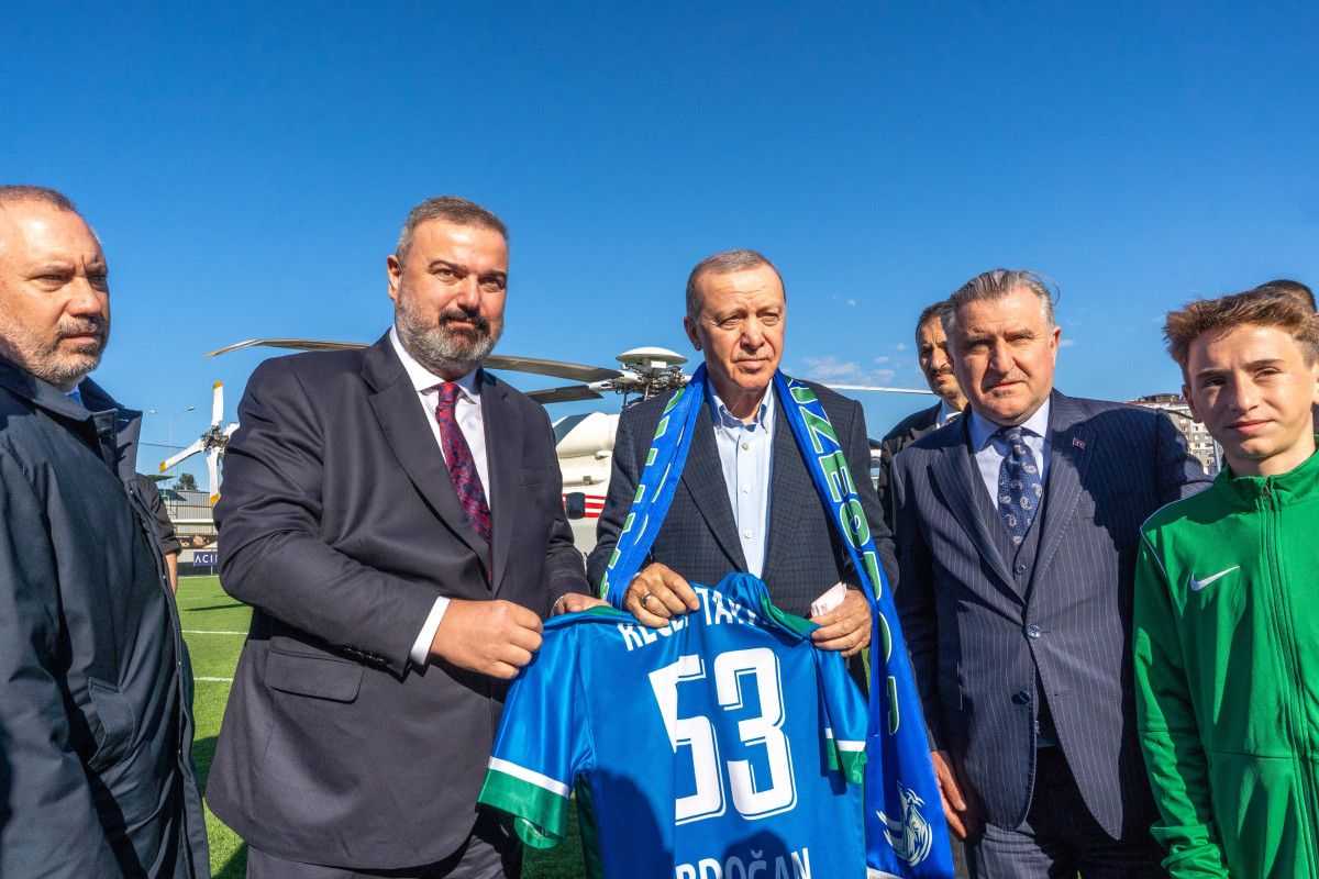 Kulüp Başkanı İbrahim Turgut tarafından karşılanan Erdoğan’a, üzerinde isminin yazılı olduğu 53 numaralı forma ve atkı hediye edildi.