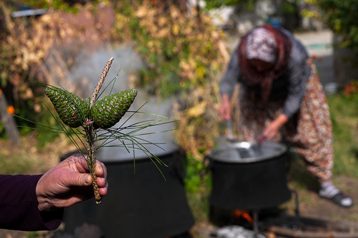 Kozak Yaylası’nın bereketli doğasında yaşayan kadınlar, her yıl mayıs ayından itibaren taze kızılçam kozalaklarını toplayarak imece geleneğini sürdürüyor. Keser yardımıyla ikiye bölünen kozalaklar, evlerin bahçelerinde yıkanıp bakır kazanlara alınarak odun ateşinde kaynatılıyor.