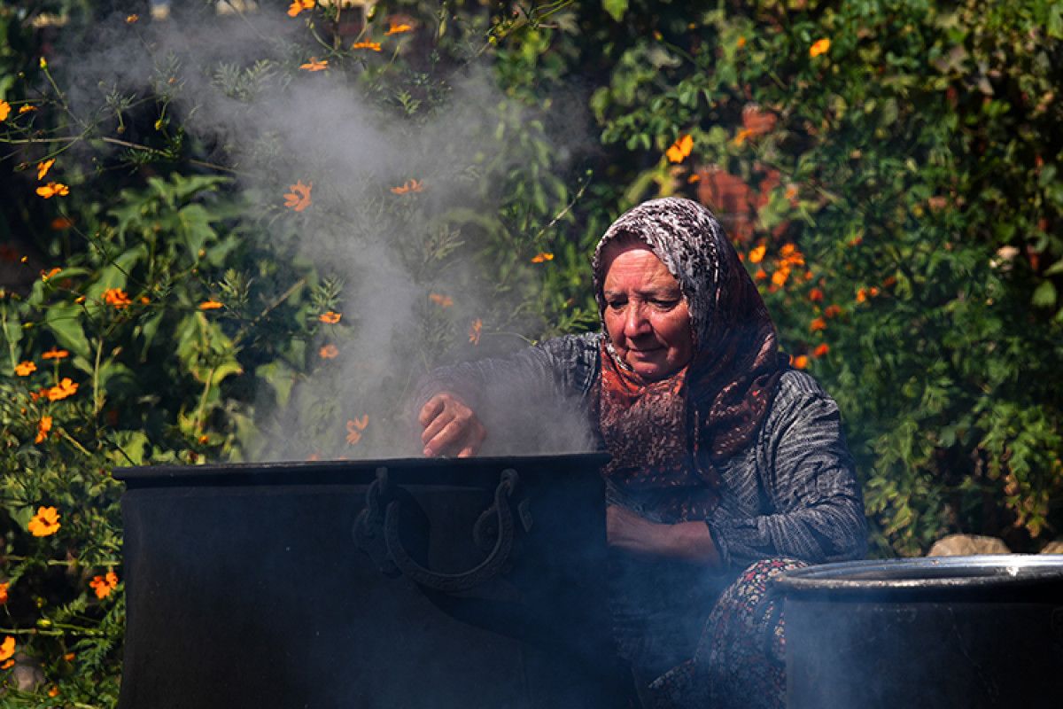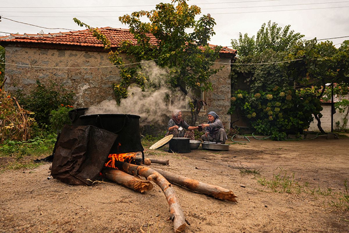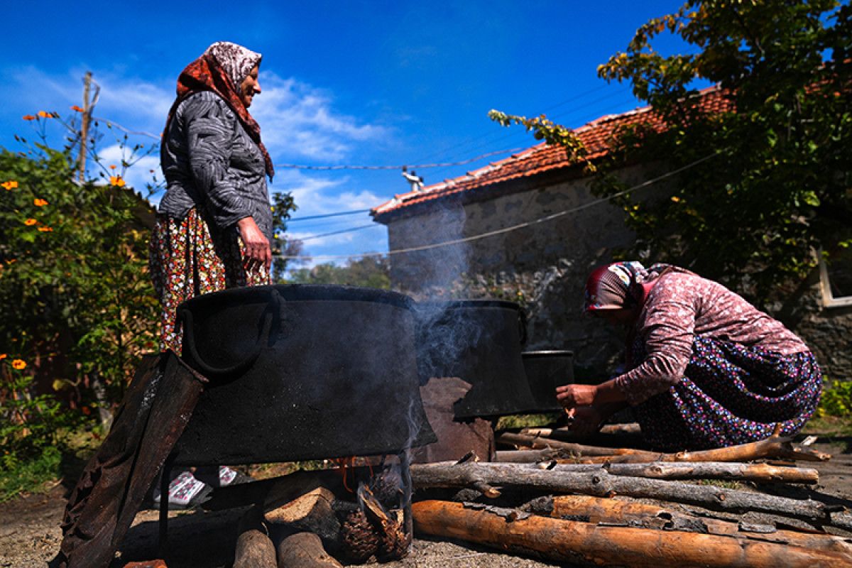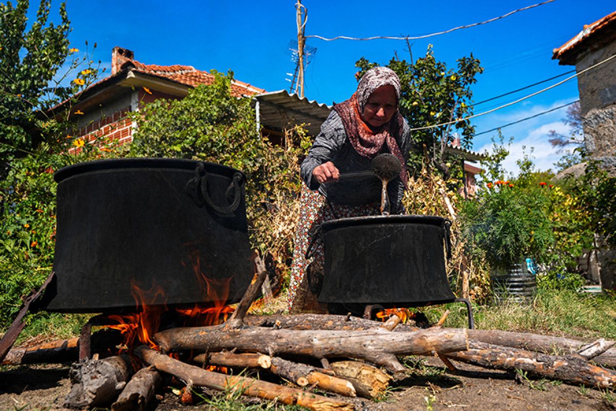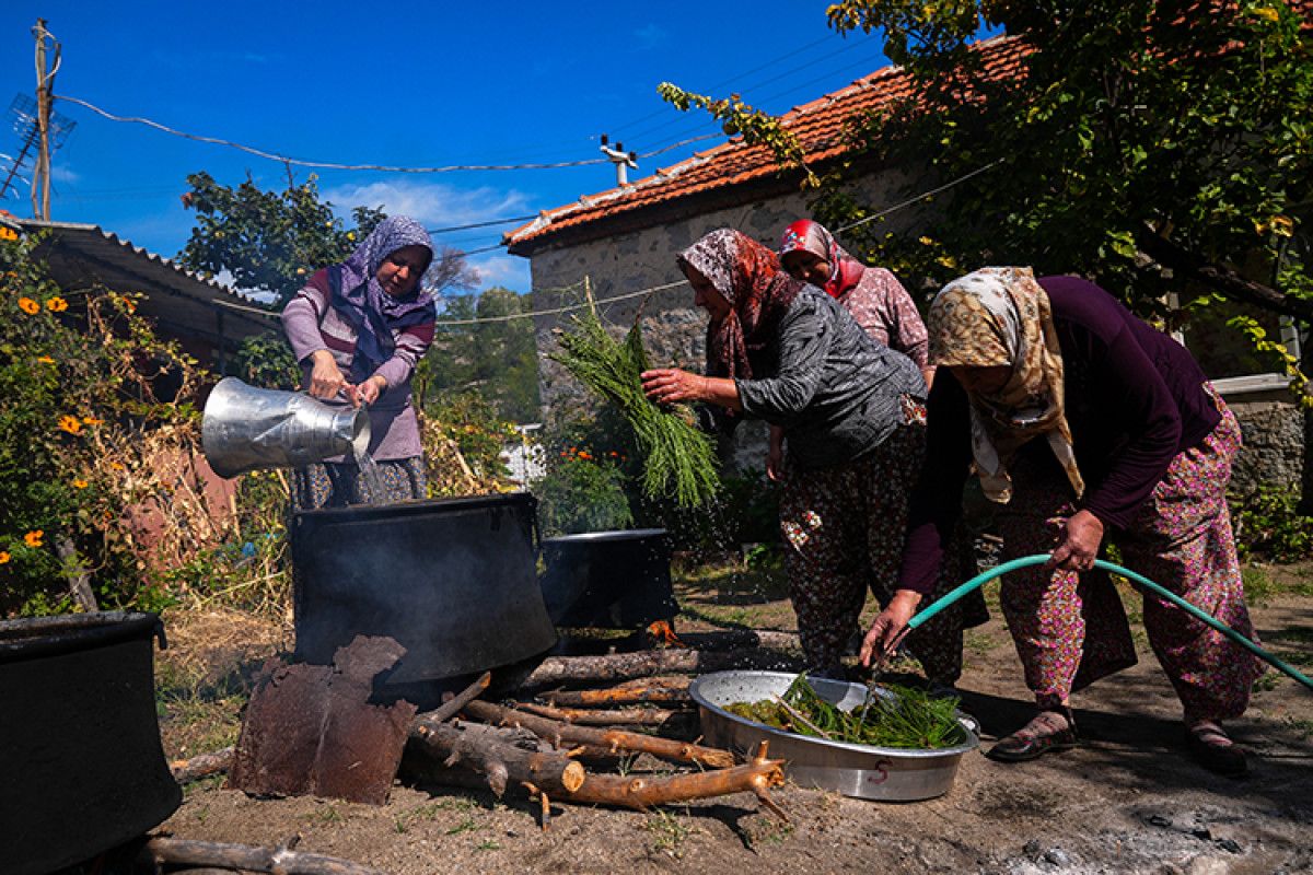 İzmir’in Bergama ilçesindeki kadınlar, Kozak Yaylası’ndaki kızılçam ağaçlarının kozalaklarıyla imece usulü pekmez yapıyor.