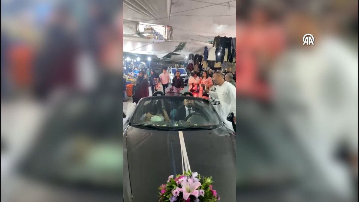 Gelin arabasının daha sonra pazar içinde yoluna devam etmesi, çevredekilerin de yaşananları gülümseyerek izlemesi görüntülerde yer aldı.