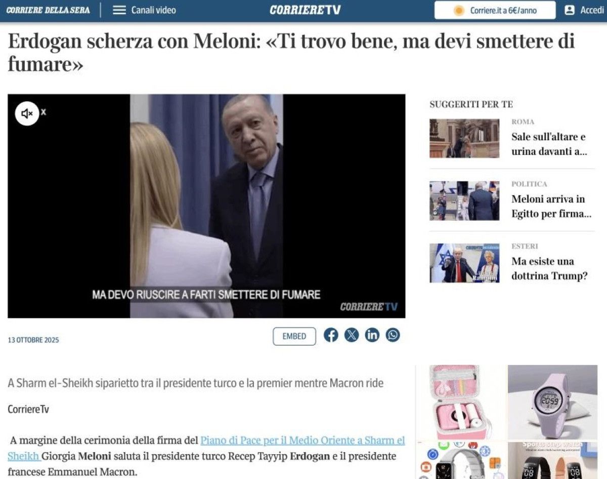 Corriere Della Sera gazetesinin internet sitesinde, “Erdoğan, Meloni’ye takıldı” başlığıyla verilen haberde Erdoğan ve Meloni’nin samimi bir an paylaştığı ve Erdoğan’ın İtalyan lidere gülümseyerek sigarayı bırakması gerektiğini söylediği kaydedildi.