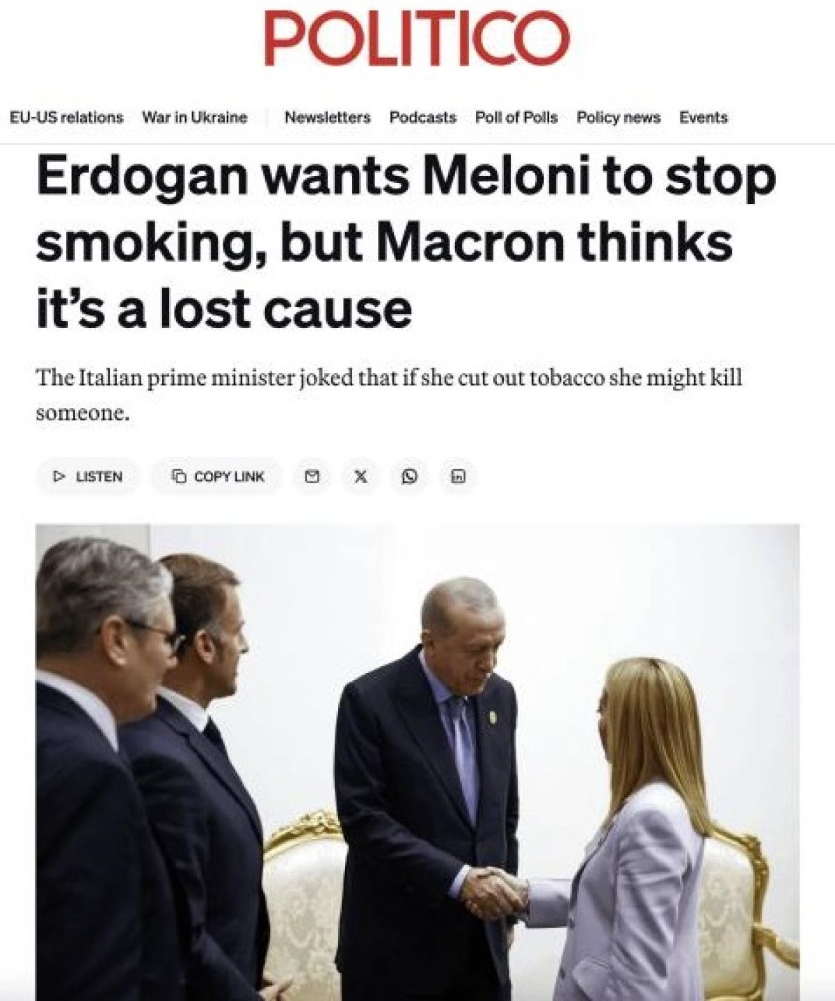 ABD merkezli haber kuruluşu Politico’nun Avrupa baskısı, “Erdoğan, Meloni’nin sigarayı bırakmasını istiyor fakat Macron, bunun ümitsiz vaka olduğu görüşünde” başlığıyla haberi sundu.