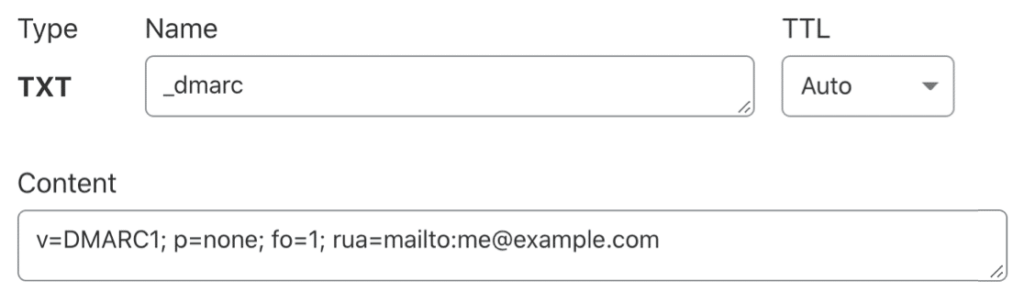 v=DMARC1; p=none; fo=1; rua=mailto:me@example.com