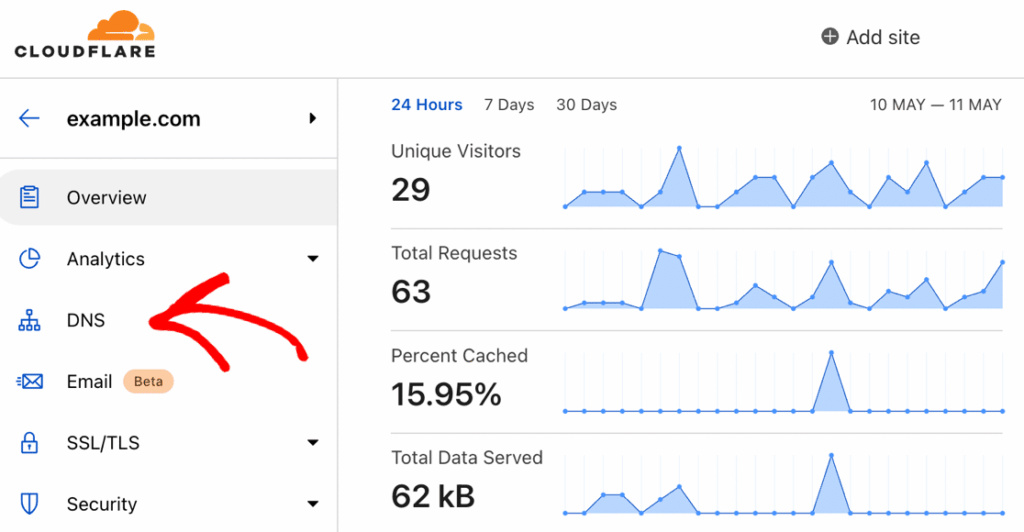 Başlamak için Cloudflare panelinizin sol tarafındaki DNS’e tıklayın.