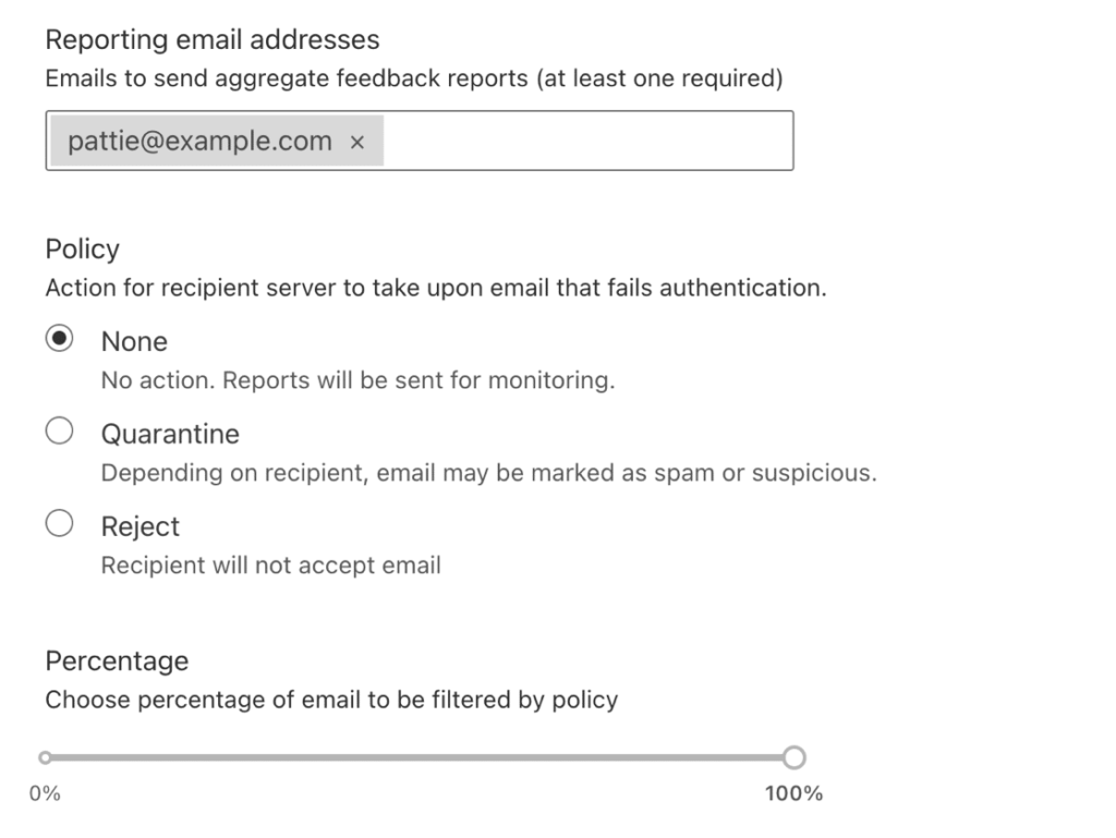 p=none. DNS’inizde bir sorun varsa yine de e-posta raporları alacaksınız, ancak bunun kendi e-postalarınızın teslim edilmesini etkilemesi olası değildir. Şüpheli DMARC raporları almaya başlarsanız, kuralın bu bölümünü olarak değiştirebilirsinizp=quarantine. - Adresi değiştirdiğinizden emin olun