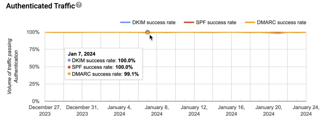 Siteniz çok fazla e-posta gönderiyorsa, Google Postmaster Tools’u kurmanız faydalı olacaktır . Kimlik Doğrulanmış trafiğinizi takip etmenizi sağlar :