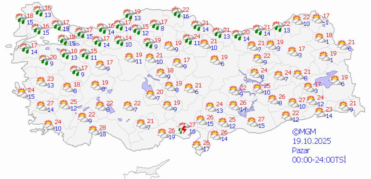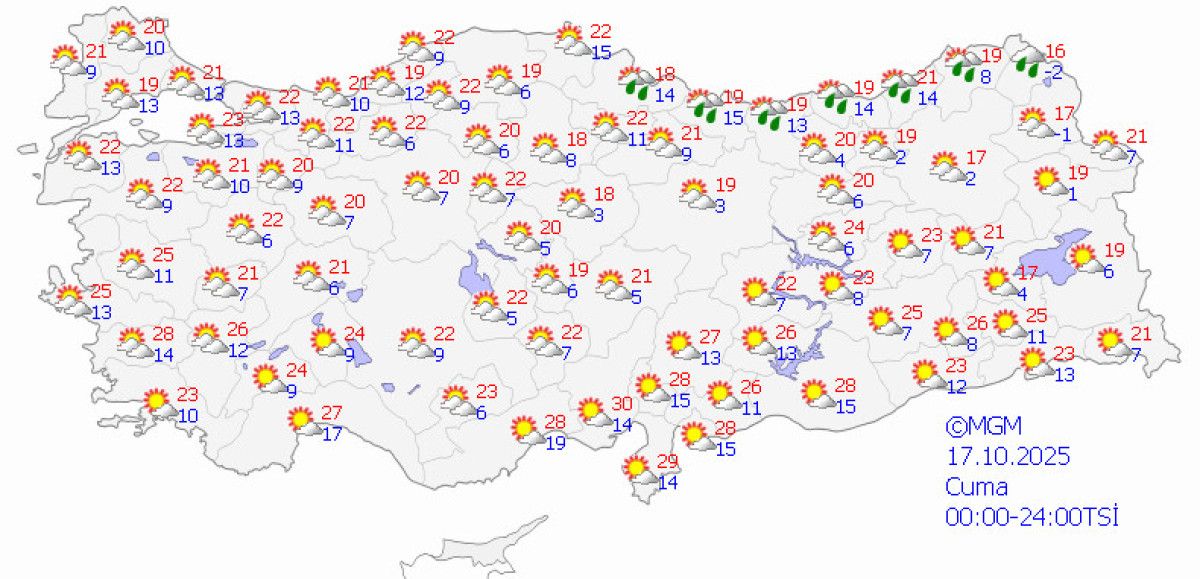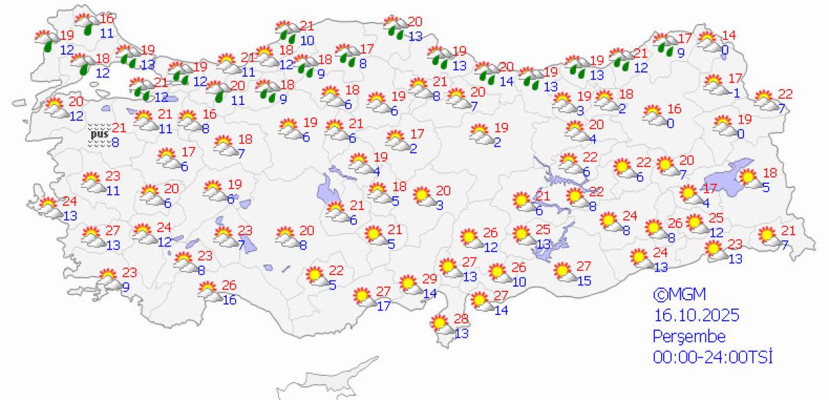 MGM’nin verilerine göre, 16 Ekim Perşembe günü, ülkenin kuzey kesimleri (Marmara, Karadeniz) parçalı ve çok bulutlu geçecek.