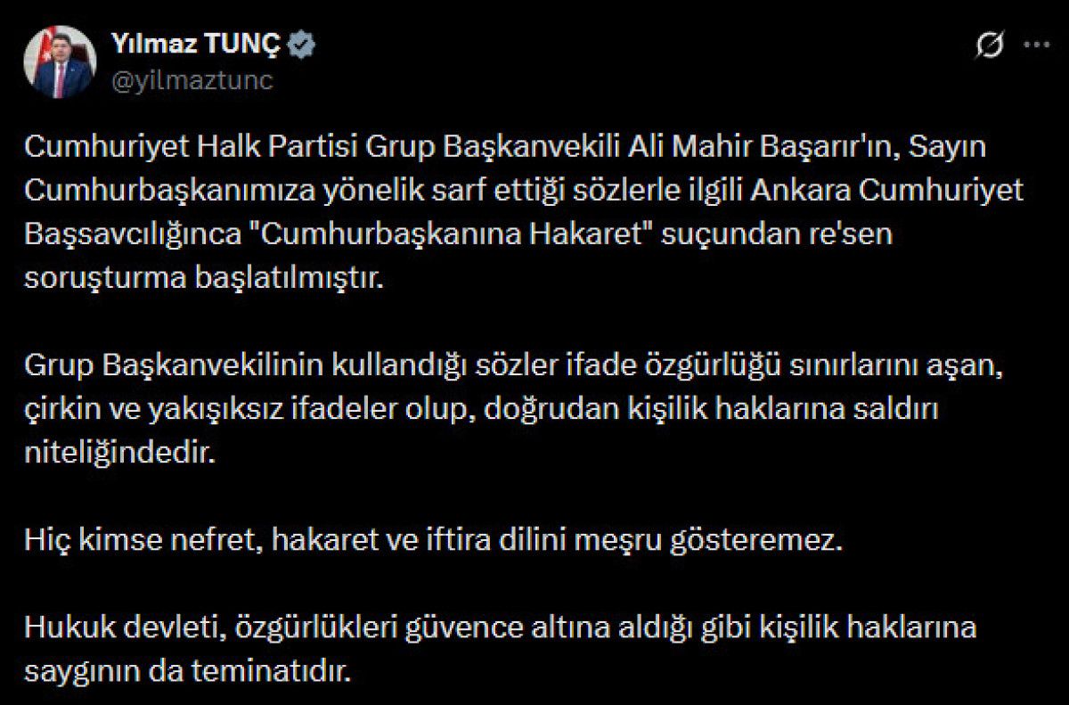 “Cumhuriyet Halk Partisi Grup Başkanvekili Ali Mahir Başarır’ın, Sayın Cumhurbaşkanımıza yönelik sarf ettiği sözlerle ilgili Ankara Cumhuriyet Başsavcılığınca ‘Cumhurbaşkanına Hakaret’ suçundan resen soruşturma başlatılmıştır. Grup Başkanvekilinin kullandığı sözler ifade özgürlüğü sınırlarını aşan, çirkin ve yakışıksız ifadeler olup, doğrudan kişilik haklarına saldırı niteliğindedir. Hiç kimse nefret, hakaret ve iftira dilini meşru gösteremez. Hukuk devleti, özgürlükleri güvence altına aldığı gibi kişilik haklarına saygının da teminatıdır”
