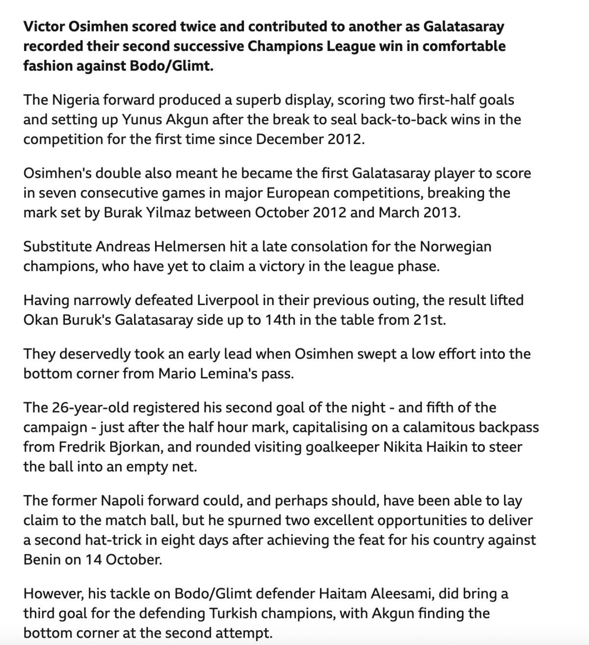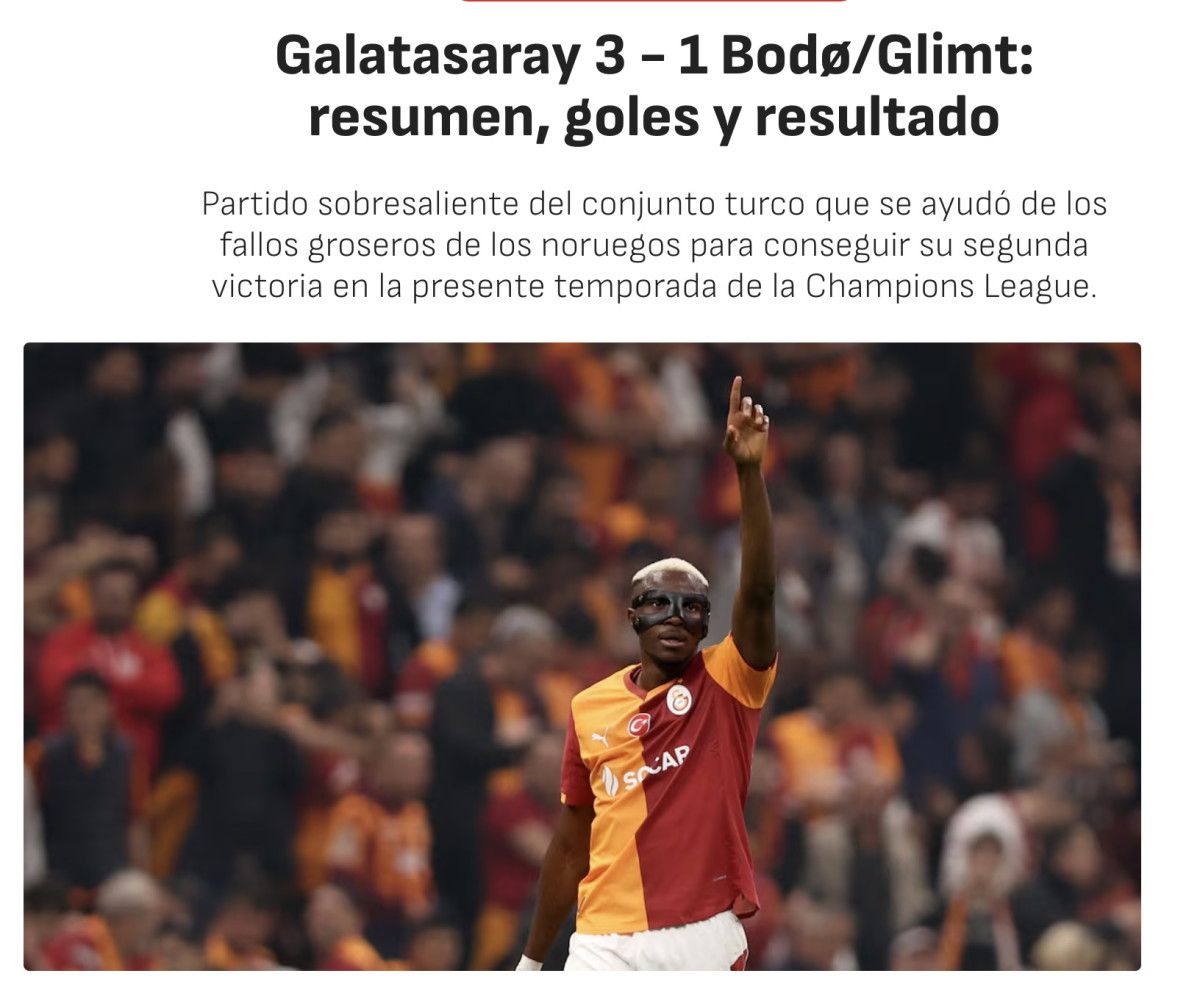 Galatasaray, Bodo/Glimt karşısında rahat bir şekilde üst üste ikinci kez Şampiyonlar Ligi galibiyetini alırken Victor Osimhen iki gol atıp bir de gol attırdı. Takımına galibiyeti getiren isim olan Osimhen maçın en iyi oyuncusuydu.