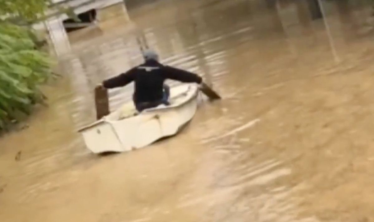 Sosyal medyada paylaşılan görüntülerde bir kişinin suyla kaplı caddede kayıkla ilerlemeye çalıştığı anlar dikkat çekti.