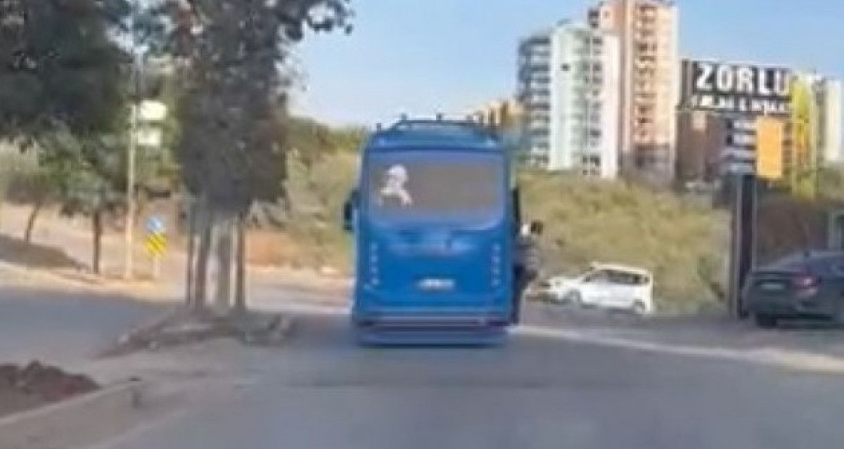 Adana’nın Sarıçam ilçesinde, hareket halindeki özel halk otobüsünün açık kapısına tutunarak yolculuk yapan iki kişi çevredeki vatandaşlar tarafından görüntülendi.